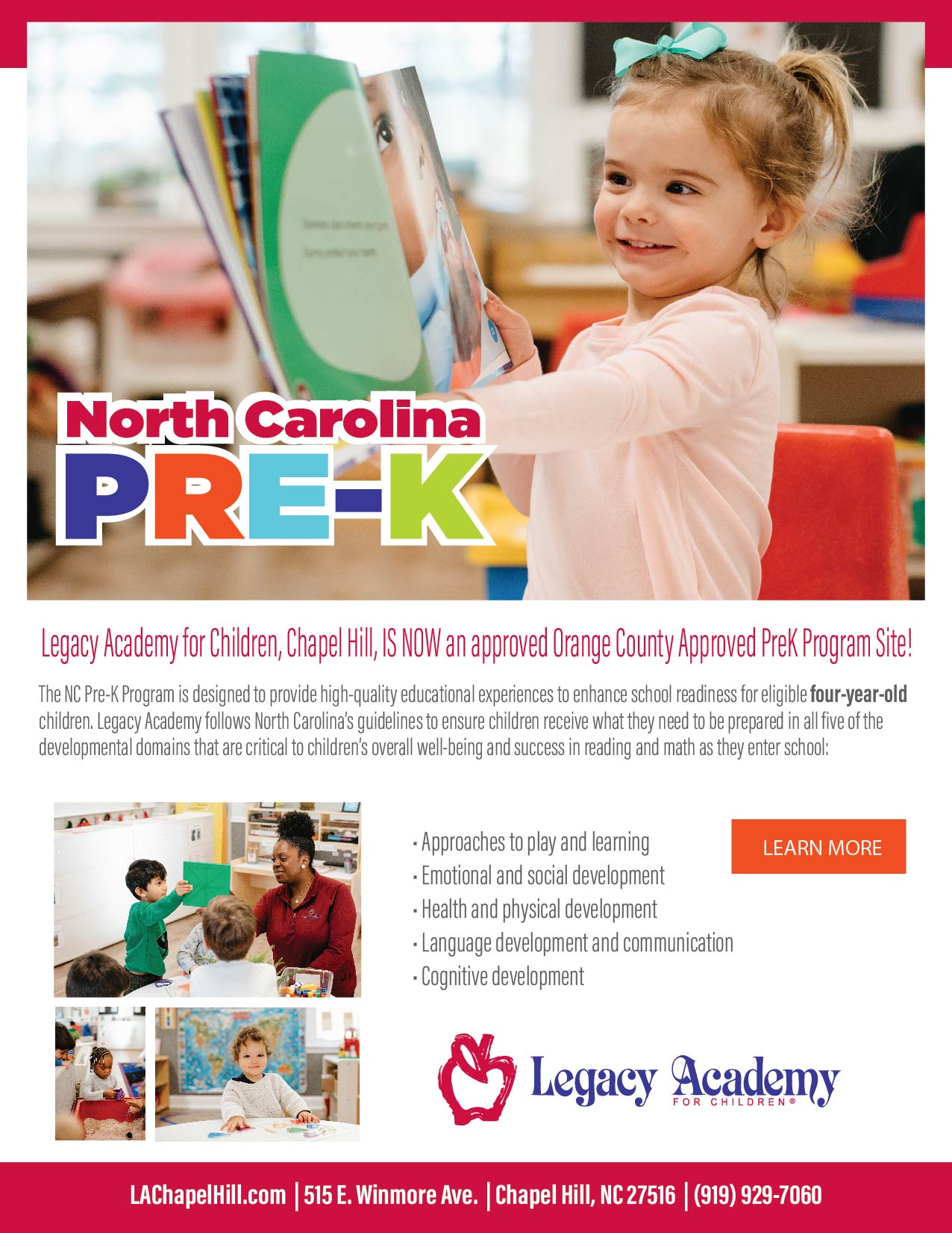 Legacy Academy of Chapel Hill is proud to announce that we are now an Orange County approved Pre-K program site. The world may look different these days, but you can still get your child ready for kindergarten in a safe, play-based, learning-centered environment. At Legacy Academy, children have always learned the skills that they need to take them to the next step in their education. Now, the Orange County Partnership for Young Children has determined that we meet their strict requirements for approval. We’re here to help your child develop the skills they need to successfully transition to kindergarten.